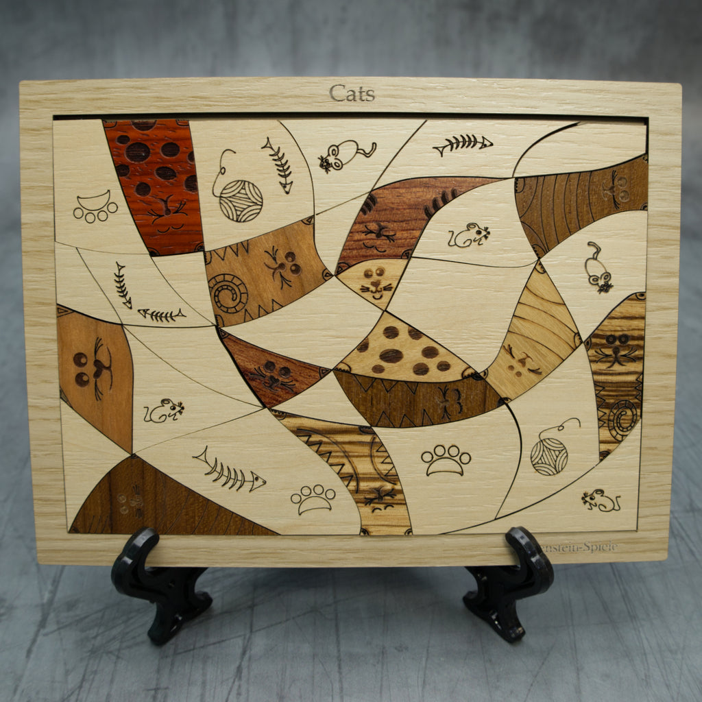 Cats by Siebenstein-Spiele is a delightful and cleverly constructed wooden packing puzzle from Germany. Each piece is uniquely shaped and decorated with playful feline-themed artwork — including paws, yarn, fish, cheese, mice, and expressive cat faces — making this puzzle as charming to look at as it is satisfying to solve.