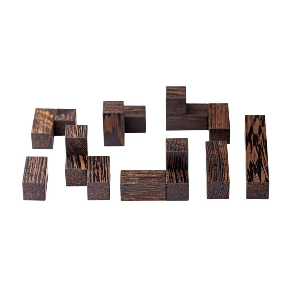 The objective is to insert all seven internal pieces through the extremely limited opening and construct a complete 3×3×3 cube inside the box. Once assembled, a long “key” piece is used to lock the structure in place, sealing the contents securely. The solved state forms a striking, symmetrical tower — but reaching it is anything but simple.