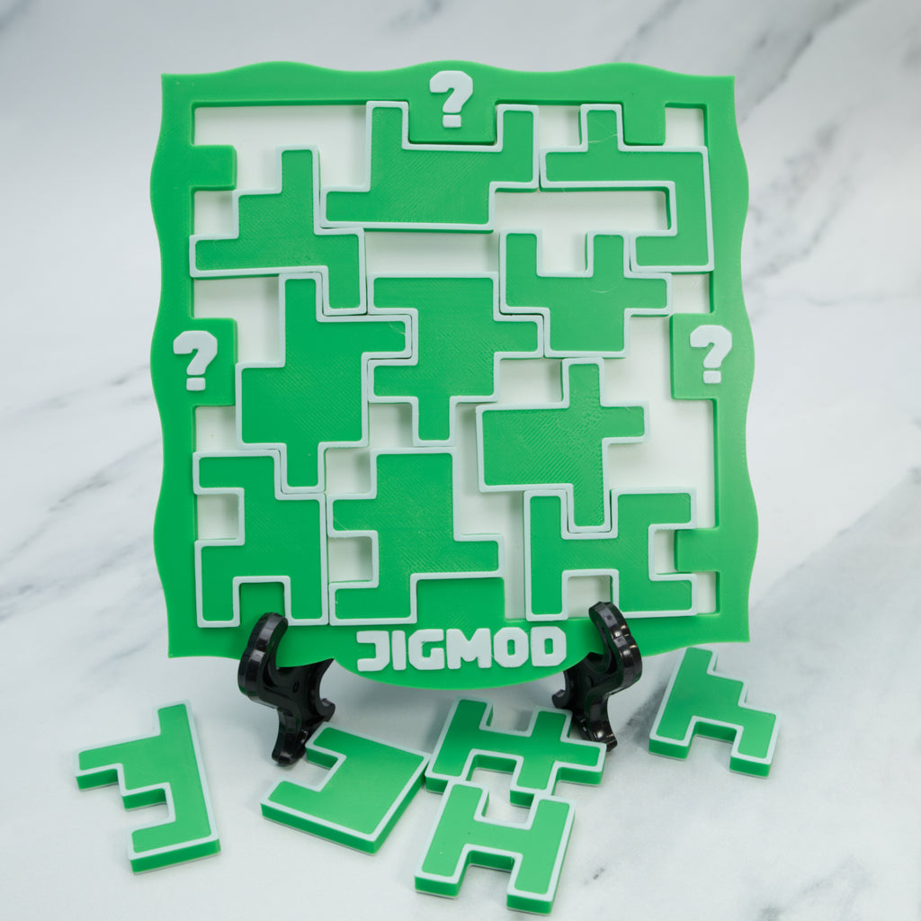 Crown your packing puzzle mastery with Jigmod, the grand finale in Dan Fast's acclaimed Jig series, designed for Puzzle Playground and produced by Team JB Hobbies. Showcasing a fresh green and white frame with green pieces outlined in white borders, this pinnacle challenge requires fitting all 15 pieces into the tray for an impeccable, fully filled assembly—no empty spaces, just pure, head-scratching spatial triumph.