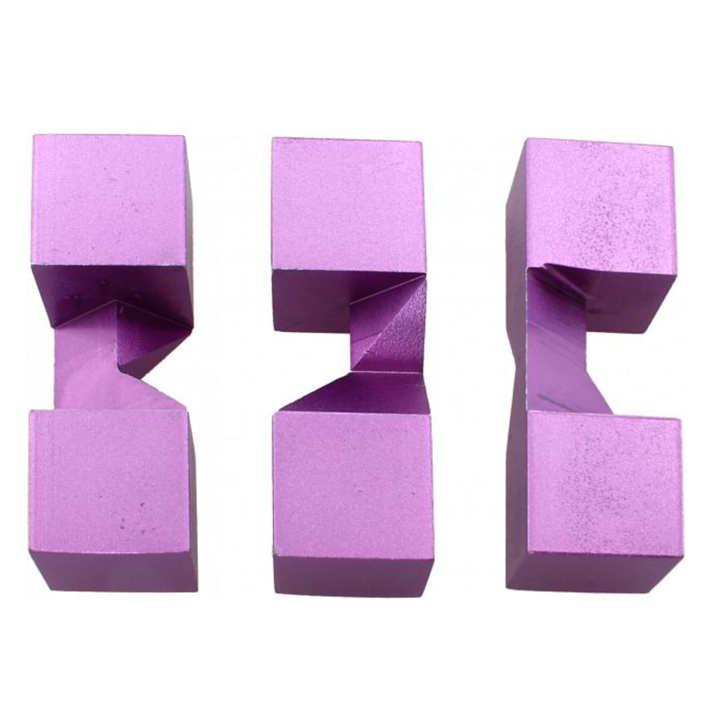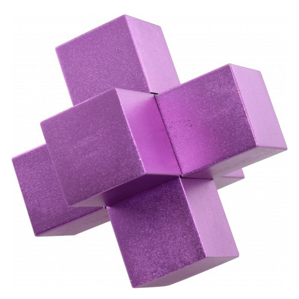 Slideways is a sleek metal disentanglement puzzle designed by Ray Stanton and produced by Puzzle Master. Made from sturdy purple anodized metal, this elegant brainteaser forms a perfectly symmetrical three-dimensional cross when assembled.