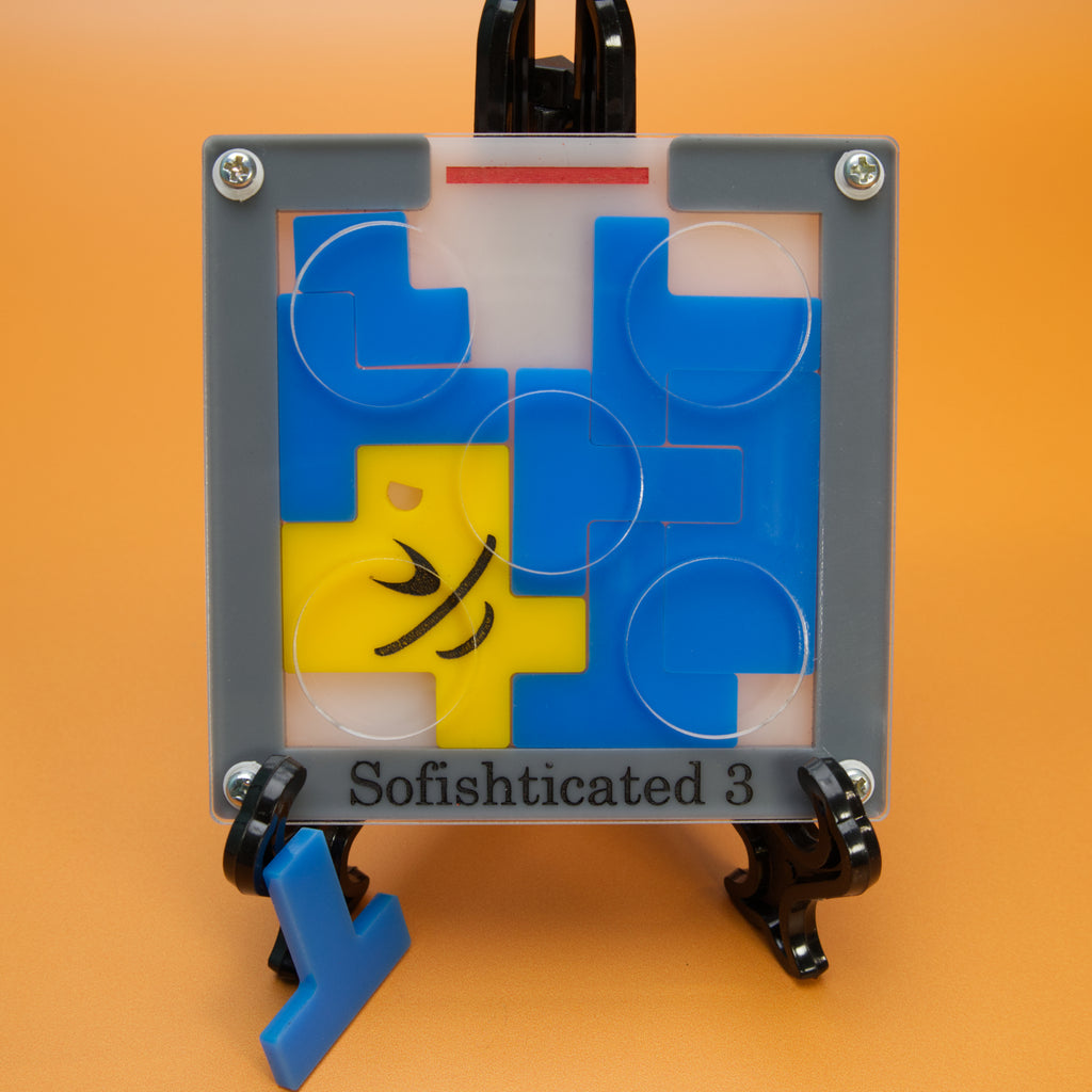 Crafted by Rex Rossano Perez, Sofishticated 3 brings a playful underwater theme to packing puzzles, where seven blue water pieces and a yellow fish must slide through a restrictive top and settle past the red line. The challenge lies in their shapes and the opening's constraints, demanding strategic placement for a fluid solution. This 2D acrylic puzzle is compact and visually appealing, perfect for thematic enthusiasts seeking a clever, contained test of skill.